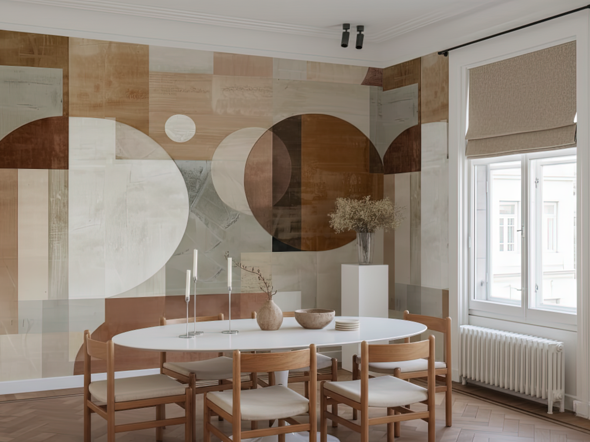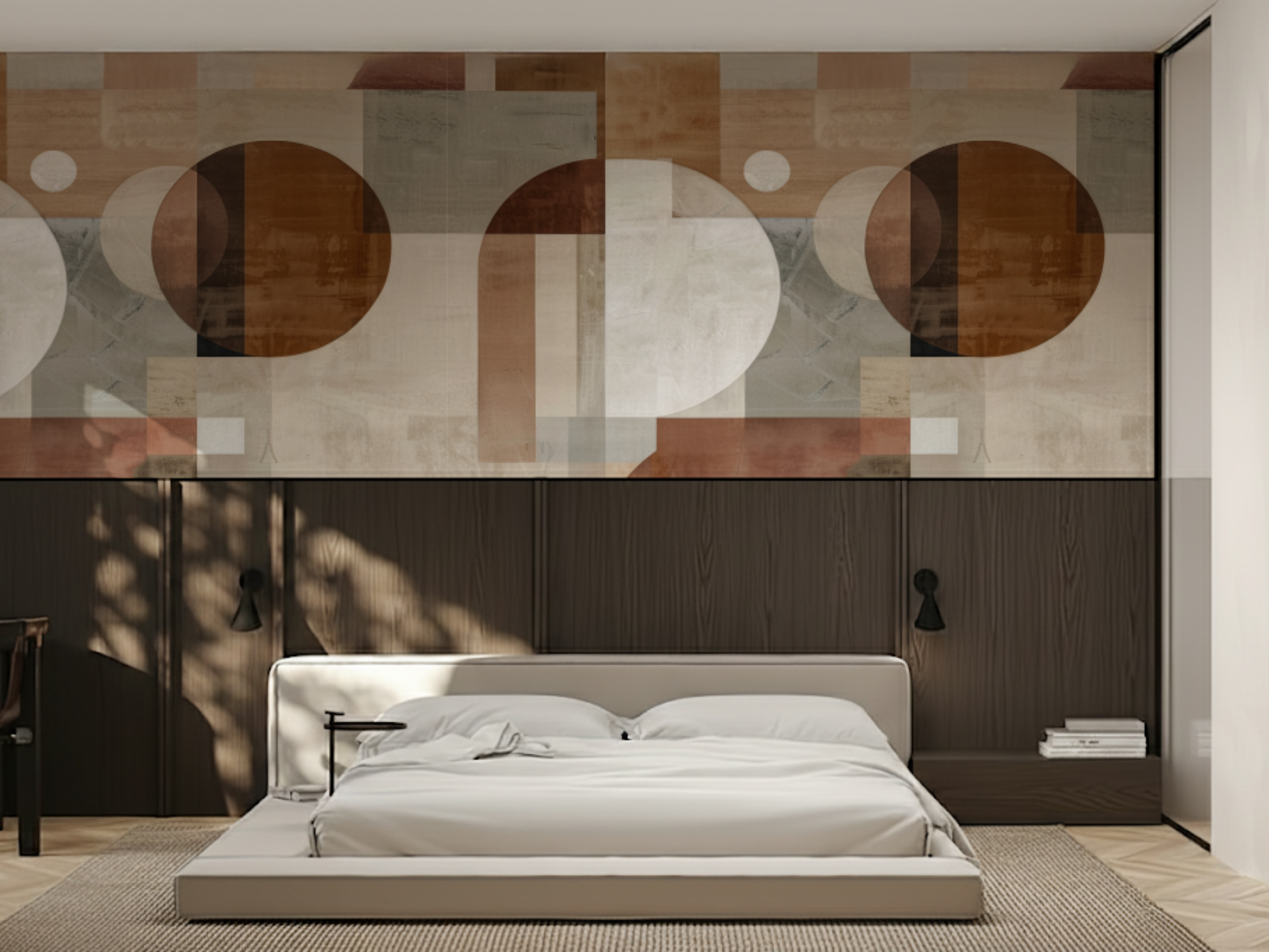 Inspired by the shifting light of morning and the geometry of gentle motion, this Japandi wallpaper captures balance in transition. Warm, layered tones meet soft-edged forms—evoking quiet awakenings and intentional movement. A space to breathe, a space to be.