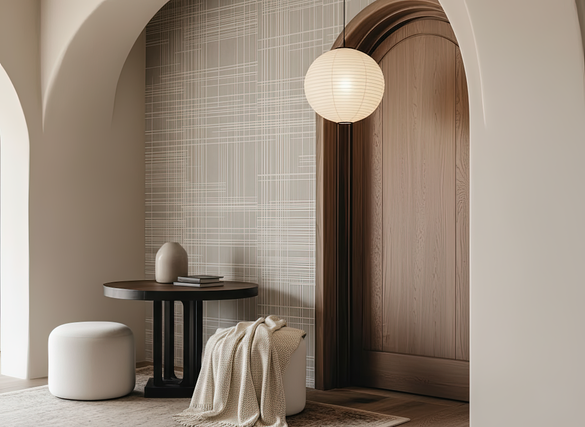 Inspired by woven textiles and the calm geometry of Japanese screens, this Japandi wallpaper brings harmony through intersecting lines. An elegant balance between structure and softness—each line a thread in a quiet story. A space to breathe, a space to be.