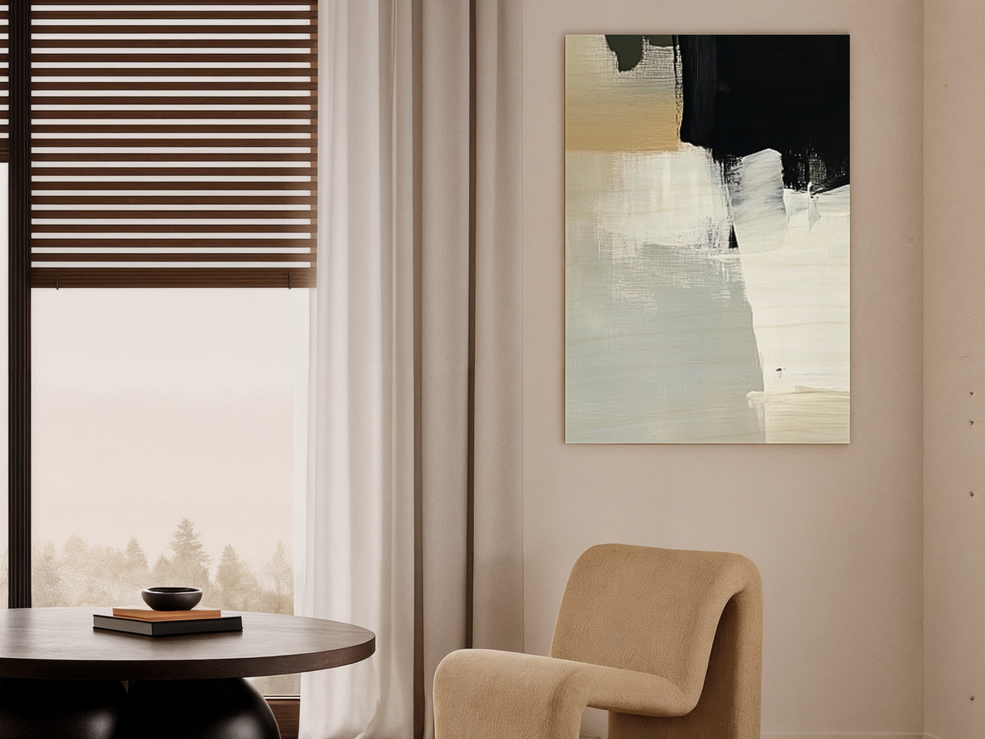 Tranquil Divide is a mesmerizing piece of wooden wall art that gracefully captures the essence of serene simplicity. The design is characterized by a harmonious blend of soft, neutral tones, creating a gentle contrast that evokes the peaceful transition between two distinct yet connected spaces—much like the calm boundary between land and sky at dawn.The composition features a subtle division, where the interplay of muted shades forms a tranquil line that draws the eye across the piece. The texture of the birch wood base adds an organic element, allowing the natural grain to subtly interact with the minimalist palette, enhancing the artwork’s tactile appeal.