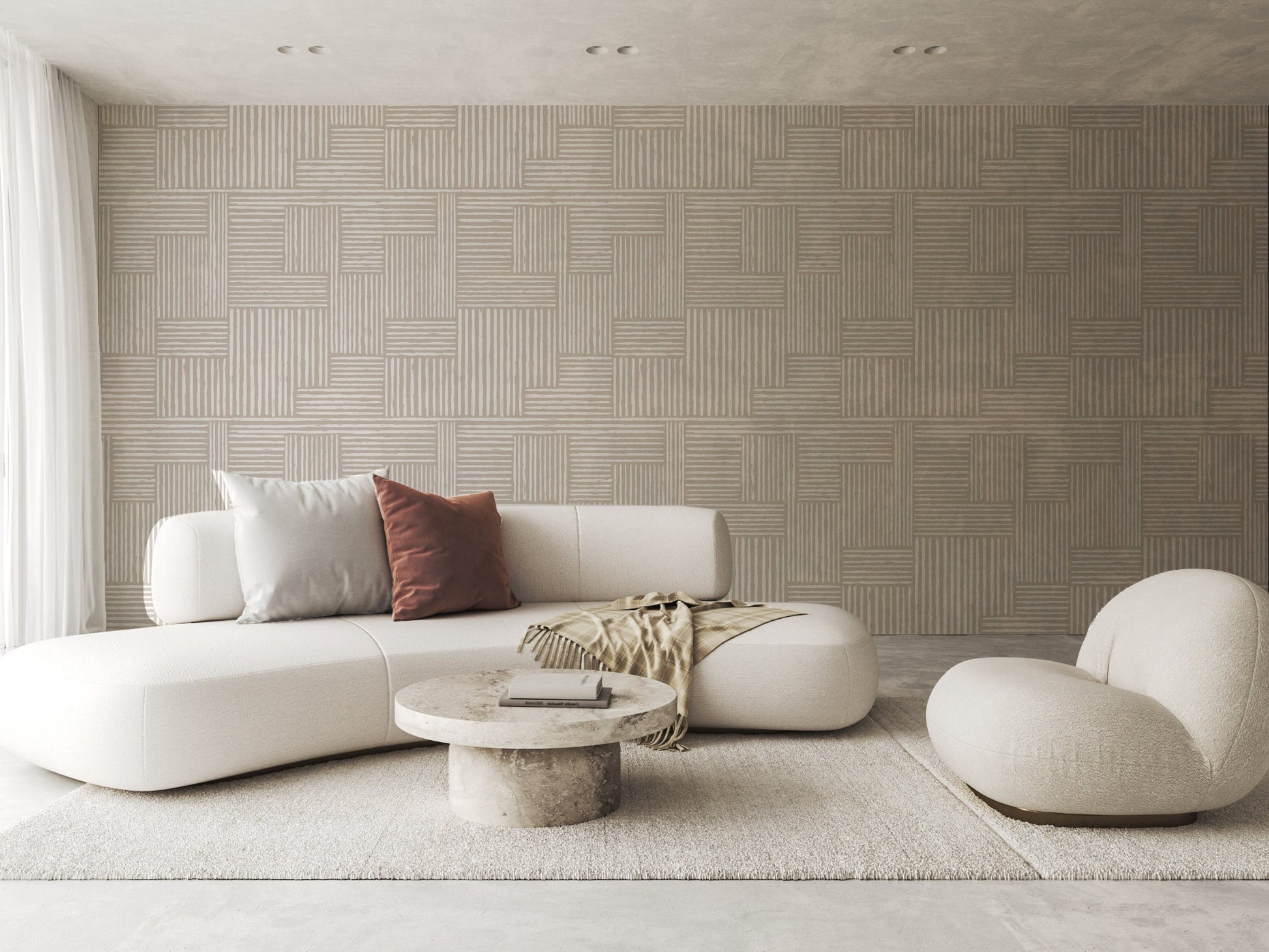 Inspired by the natural flow of wind-sculpted dunes and traditional woven forms, this Japandi wallpaper captures the harmony of rhythm and stillness. A subtle statement of balance—where serenity meets structure. A space to slow down, a space to simply be.