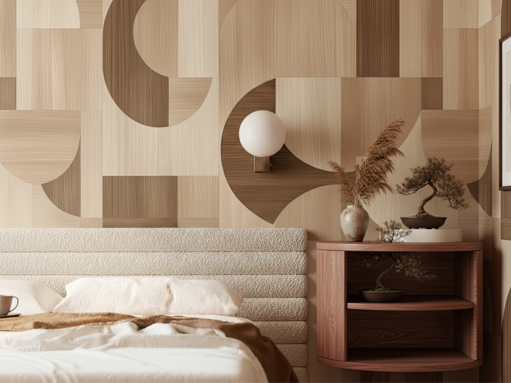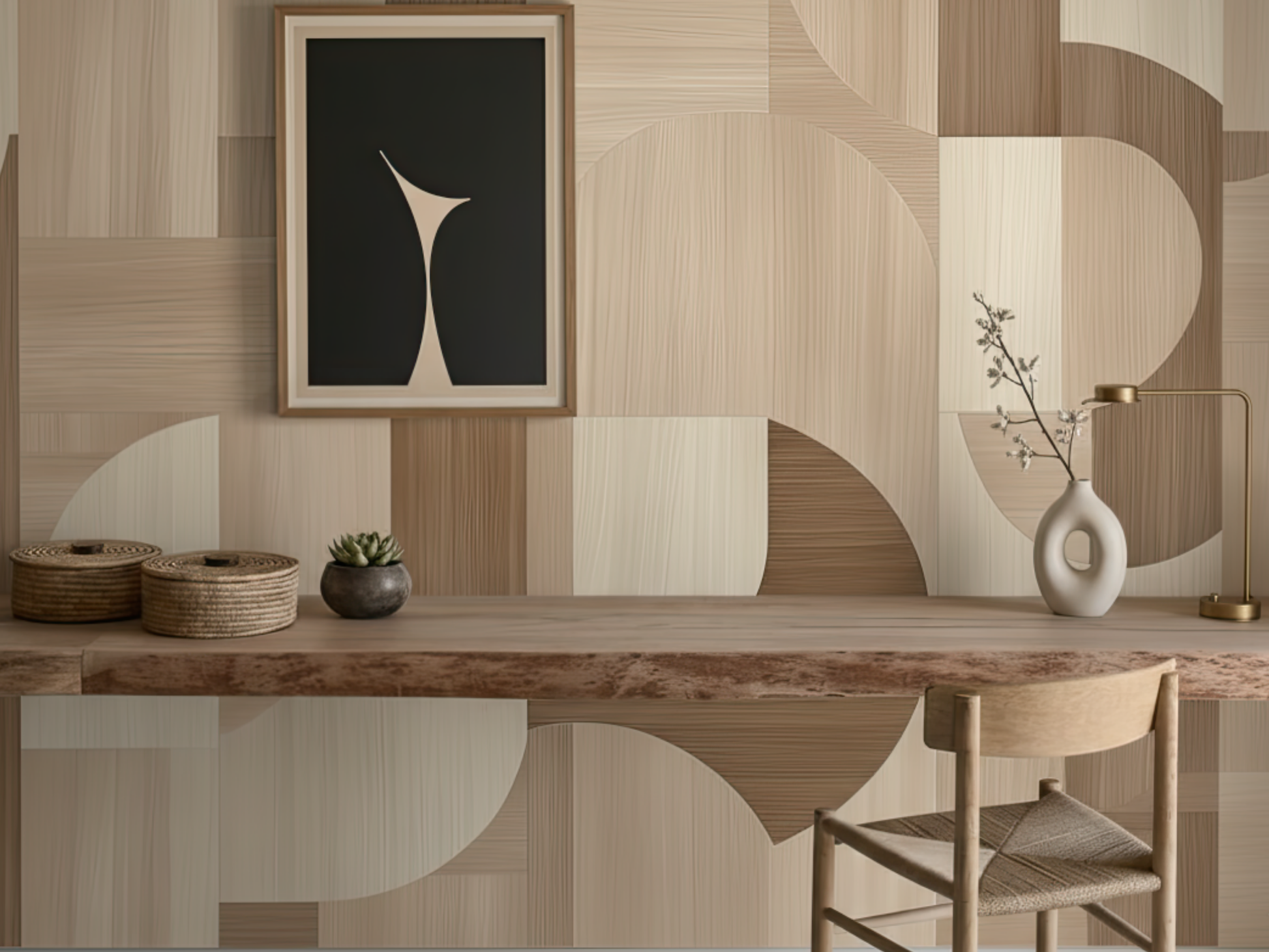 Inspired by the flowing rhythm of wood textures and geometric harmony, this Japandi wallpaper brings warmth and softness to structured spaces. A gentle dance of form and material. A space to breathe, a space to be.