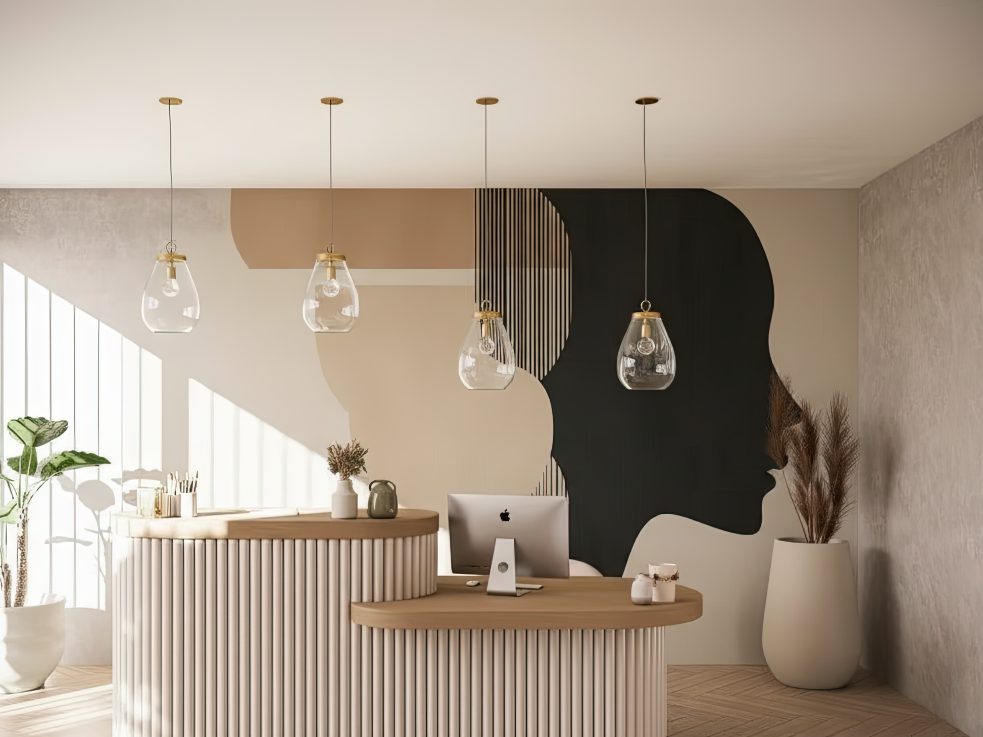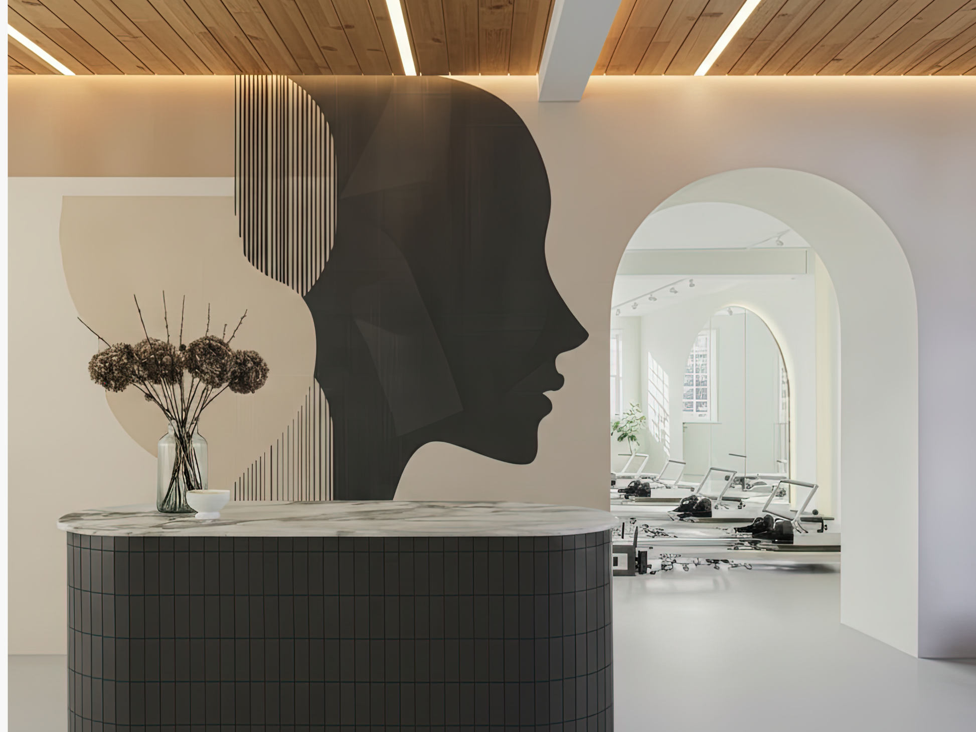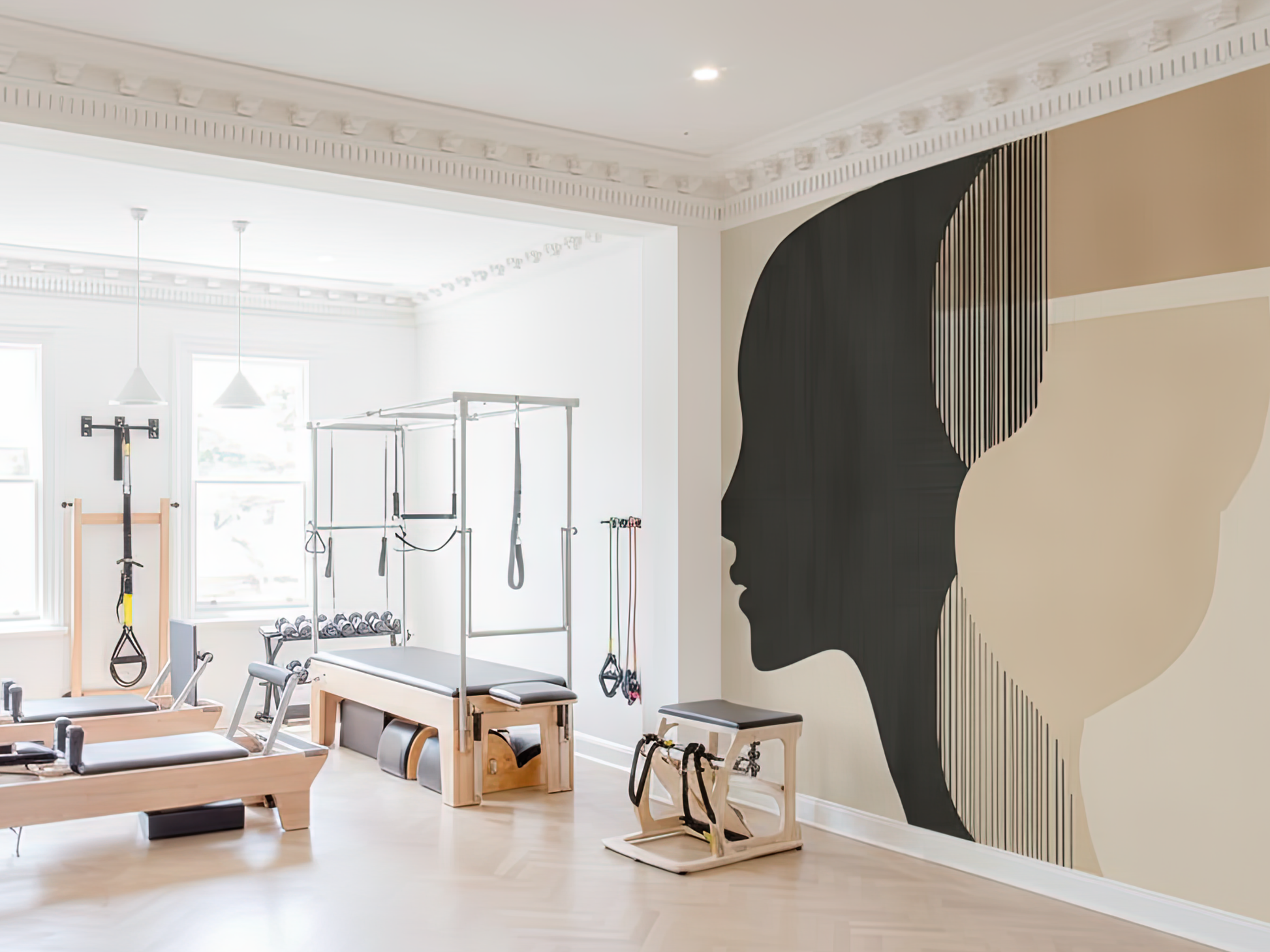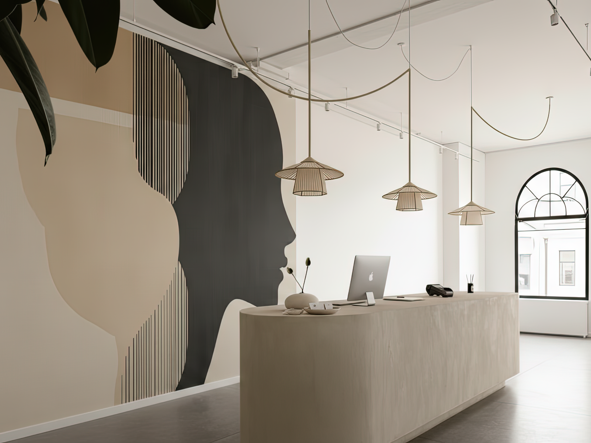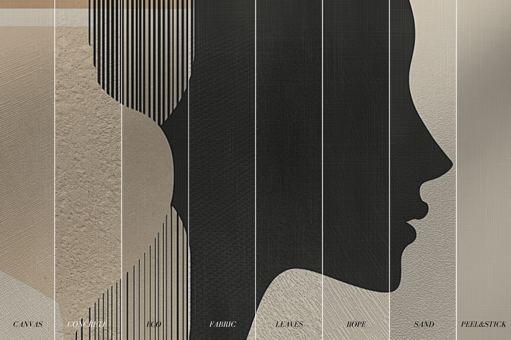 This Japandi wallpaper traces the meeting of contrast and rhythm. A bold black silhouette rests against a field of soft beige, its profile mirrored by layers of curved forms and vertical lines that ripple like sound waves. The design is both precise and fluid, where structure becomes grace, and shadow becomes presence. It is not only a depiction of form, but of flow, the quiet reminder that stillness and movement can coexist. A mural for spaces that seek harmony, depth, and contemplative calm
