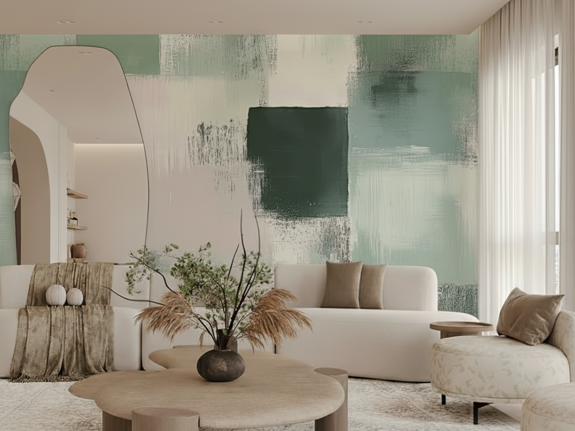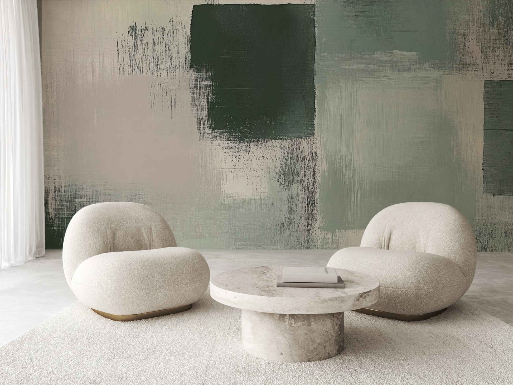 Inspired by misty mornings and layered brushwork, this Japandi wallpaper blends soft greens, muted greys, and diffused textures in peaceful abstraction. A gentle nod to tranquillity, depth, and breath. A space to drift. A space to be.