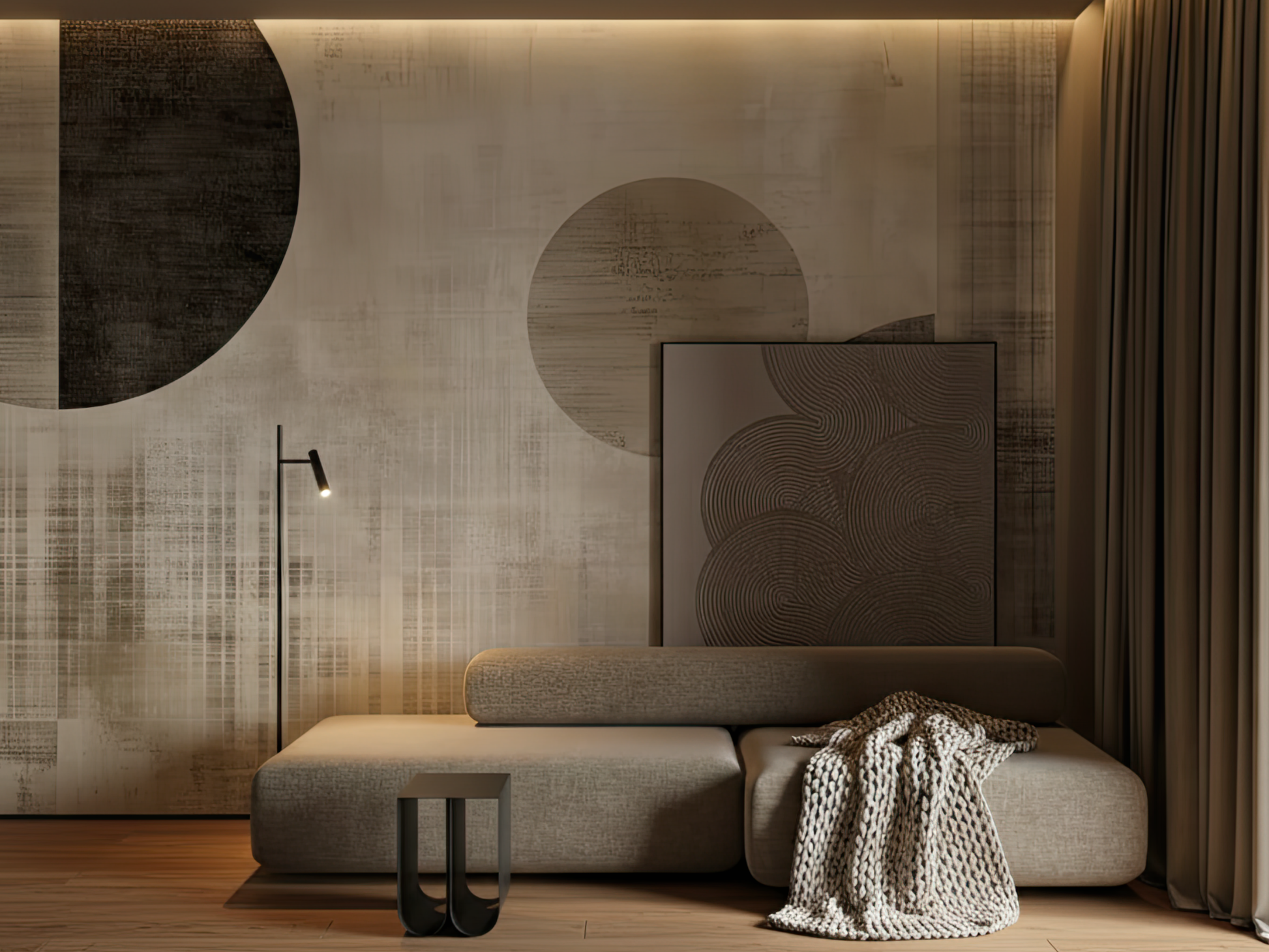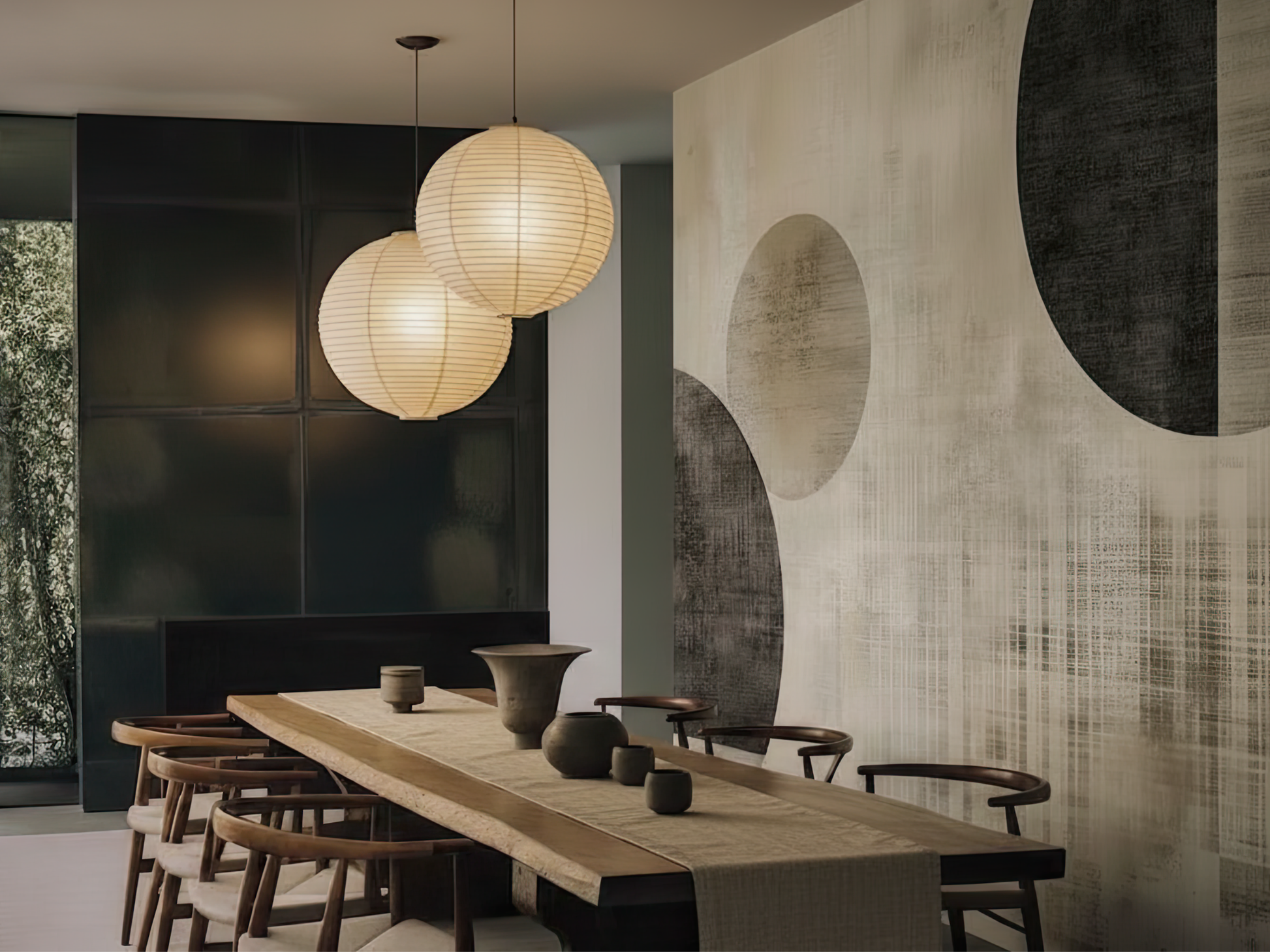 Inspired by the rising sun and the quiet interplay of shadow and light, this Japandi wallpaper blends soft geometry with radiant calm. Faded textures and floating forms evoke a sense of weightlessness and reflection. A space to lift. A space to be.