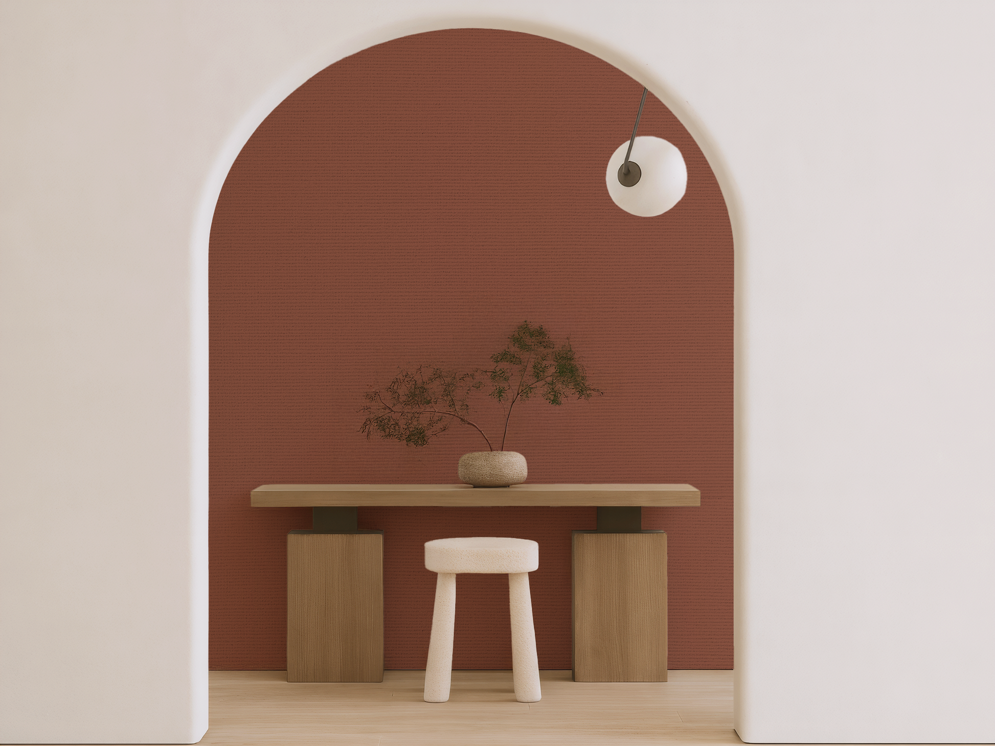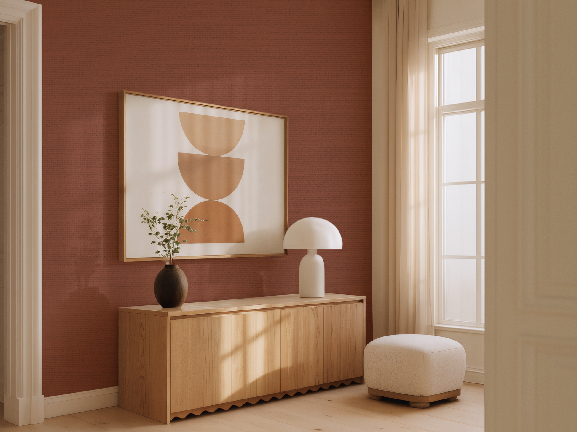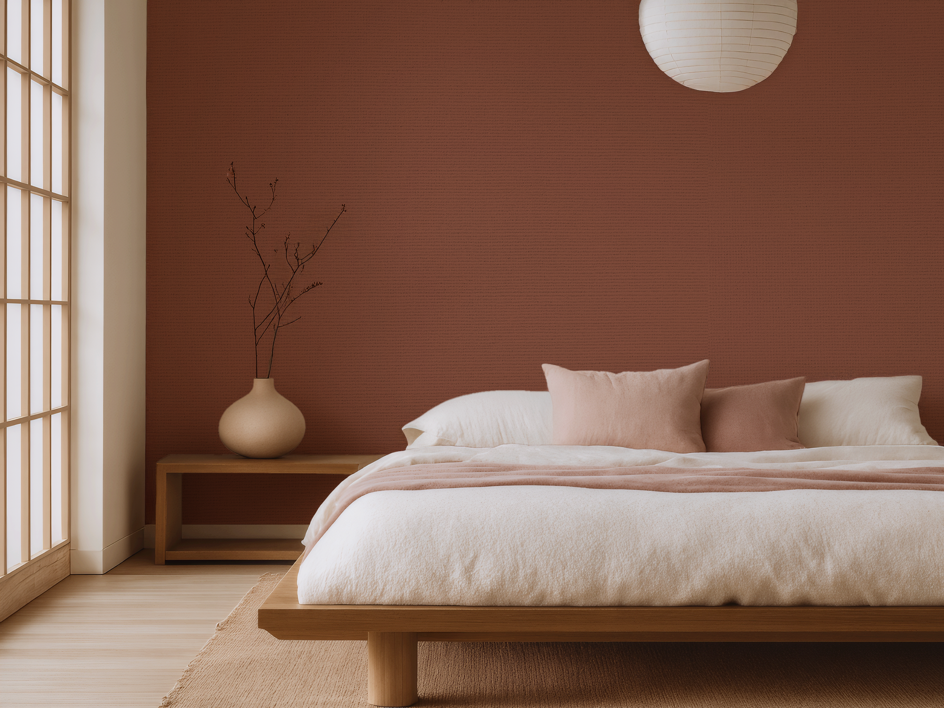 Drawn from the rich soils of ancient clay and the warmth of sunlit earth, this Japandi wallpaper hums with quiet intensity. A deep terracotta softened by time, it carries the calm of tradition and the depth of presence. There is no rush here, only weight, warmth, and wisdom. A wall that anchors. A room that breathes. A moment of stillness, held in colour.