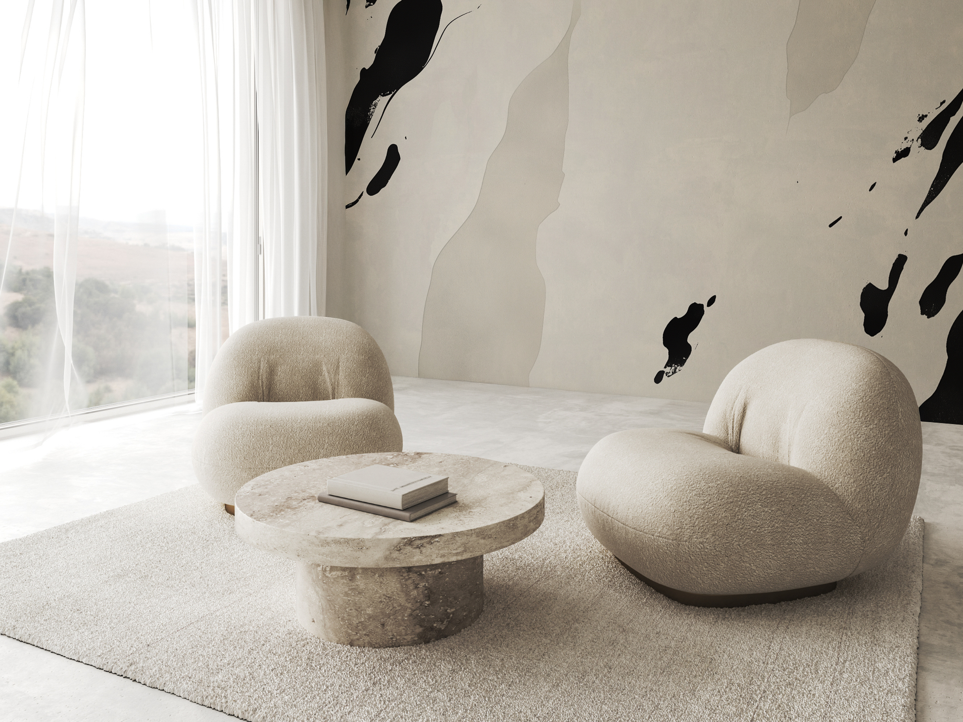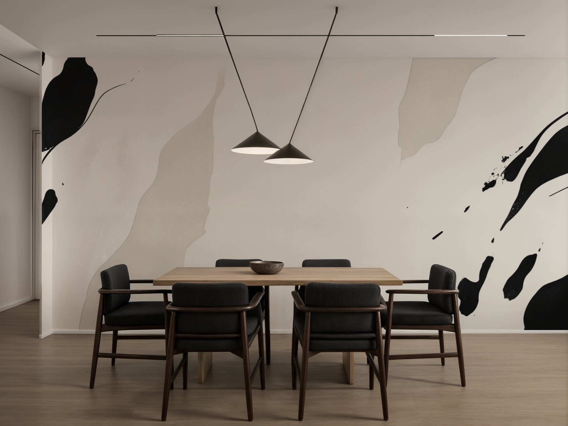 Inspired by traditional sumi-e brushwork, this Japandi wallpaper flows like a meditative stroke across fine paper. Soft gradients and dynamic gestures meet in serene contrast, where black ink dances with emptiness. A space to breathe, a space to be.
