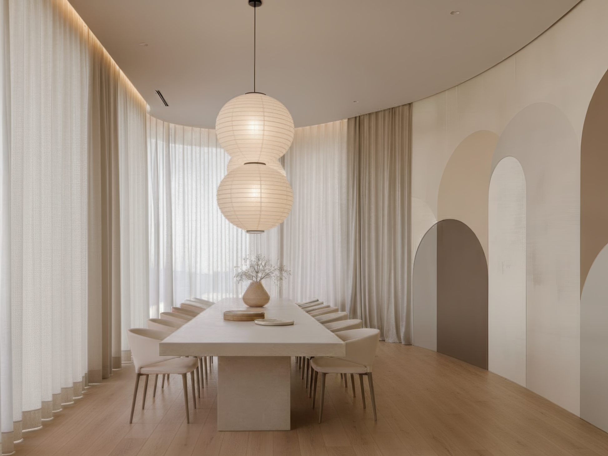 Inspired by architectural arches and the soft rhythm of retreat, this Japandi wallpaper blends sculptural simplicity with grounded warmth. A space to breathe, a space to be.
